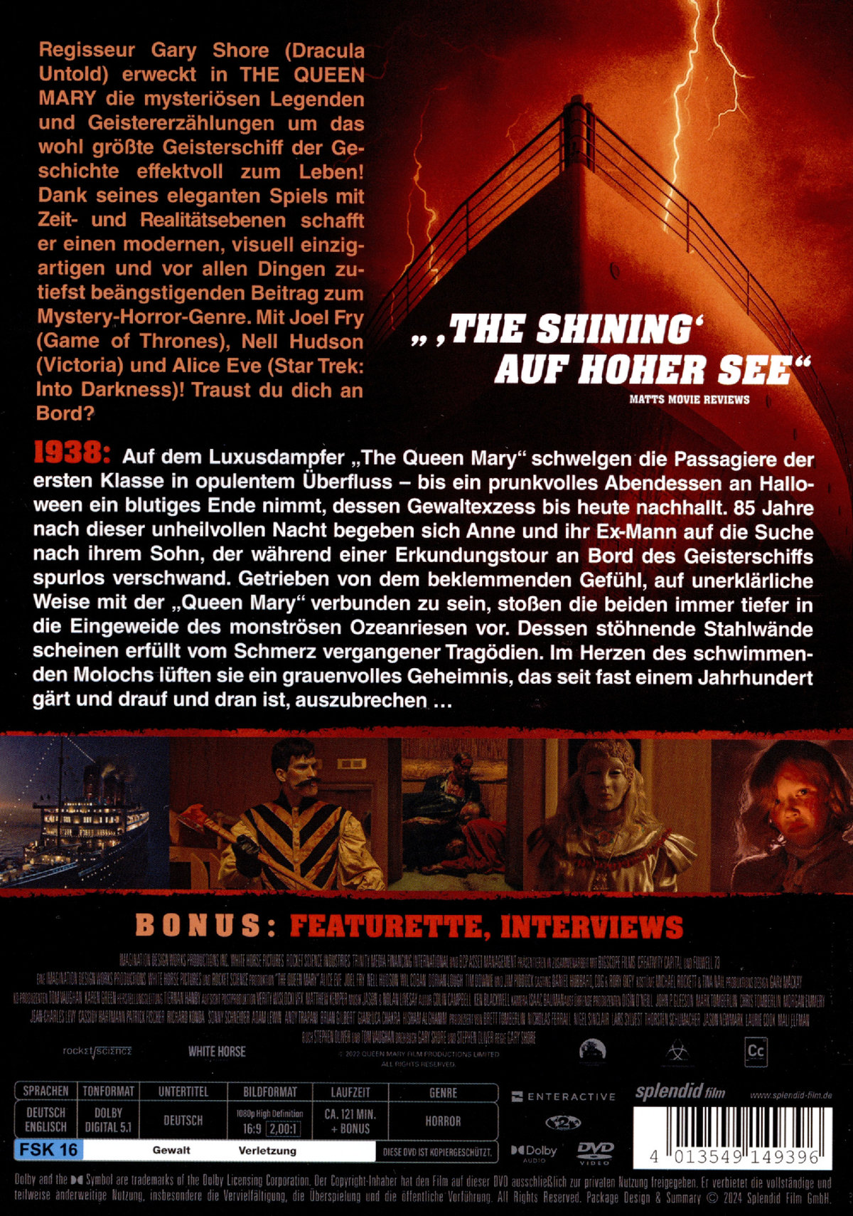 1938: Auf dem Luxusdampfer „The Queen Mary“ schwelgen die Passagiere der ersten Klasse in opulentem Überfluss – bis ein prunkvolles Abendessen an Halloween ein blutiges Ende nimmt, dessen Gewaltexzess bis heute nachhallt. 85 Jahre nach dieser unheilvollen Nacht begeben sich Anne und ihr Ex-Mann auf die Suche nach ihrem Sohn, der während einer Erkundungstour an Bord des Geisterschiffs spurlos verschwand. Getrieben von dem beklemmenden Gefühl, auf unerklärliche Weise mit der „Queen Mary“ verbunden zu sein, stoßen die beiden immer tiefer in die Eingeweide des monströsen Ozeanriesen vor. Dessen stöhnende Stahlwände scheinen erfüllt vom Schmerz vergangener Tragödien. Im Herzen des schwimmenden Molochs lüften sie ein grauenvolles Geheimnis, das seit fast einem Jahrhundert gärt und drauf und dran ist, auszubrechen …