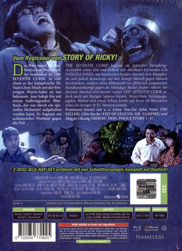 Im thailändischen Dschungel spielt THE SEVENTH CURSE, in dem Dr. Yuen Chen-Hsieh gegen die Wurm-Sekte kämpfen muss. Diese belegt ihn mit einem tödlichen Blutfluch, der nur durch ein spezielles Heilmittel gestoppt werden kann. Es beginnt ein Wettlauf gegen die Zeit. THE SEVENTH CURSE startet als typischer Hongkong-Actionfilm und nutzt Abenteuer-Elemente wie INDIANA JONES, mit Martial-Arts-Kämpfen, die auch gegen ein lebendiges Skelett geführt werden. Neben den Martial-Arts-Szenen enthält THE SEVENTH CURSE auch Splatter-Szenen, Shootouts, Verfolgungsjagden, Humor und etwas Erotik. Im Showdown gibt es einen bemerkenswerten Moment. Der Film hat bekannte Schauspieler wie Chow Yun-Fat (THE KILLER), Chin Siuho (FAUST DER LEGENDE, MR. VAMPIRE) und Maggie Cheung (HEROIC TRIO, POLICE STORY 1-3).
