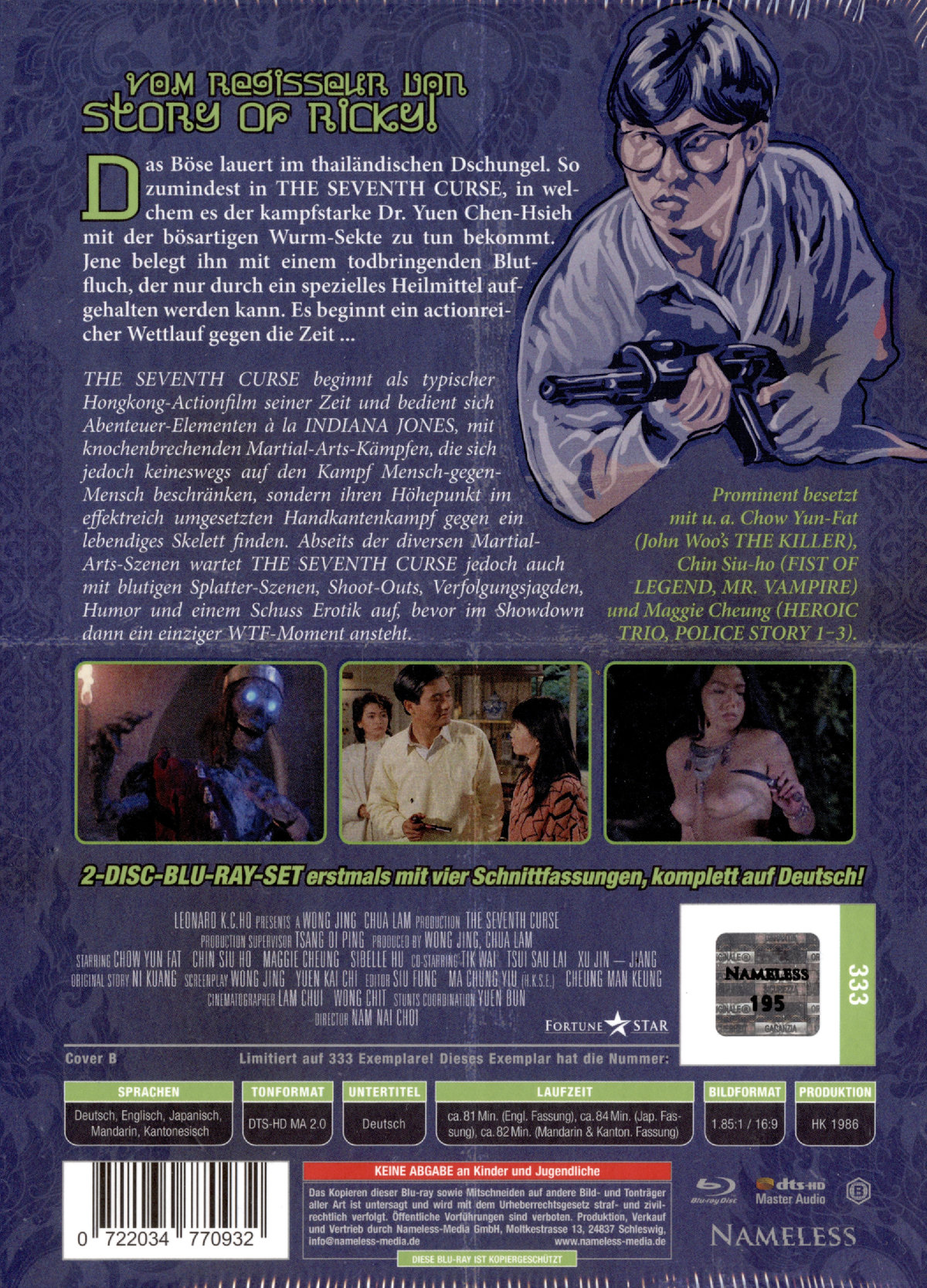 Im thailändischen Dschungel spielt THE SEVENTH CURSE, in dem Dr. Yuen Chen-Hsieh gegen die Wurm-Sekte kämpfen muss. Diese belegt ihn mit einem tödlichen Blutfluch, der nur durch ein spezielles Heilmittel gestoppt werden kann. Es beginnt ein Wettlauf gegen die Zeit. THE SEVENTH CURSE startet als typischer Hongkong-Actionfilm und nutzt Abenteuer-Elemente wie INDIANA JONES, mit Martial-Arts-Kämpfen, die auch gegen ein lebendiges Skelett geführt werden. Neben den Martial-Arts-Szenen enthält THE SEVENTH CURSE auch Splatter-Szenen, Shootouts, Verfolgungsjagden, Humor und etwas Erotik. Im Showdown gibt es einen bemerkenswerten Moment. Der Film hat bekannte Schauspieler wie Chow Yun-Fat (THE KILLER), Chin Siuho (FAUST DER LEGENDE, MR. VAMPIRE) und Maggie Cheung (HEROIC TRIO, POLICE STORY 1-3).