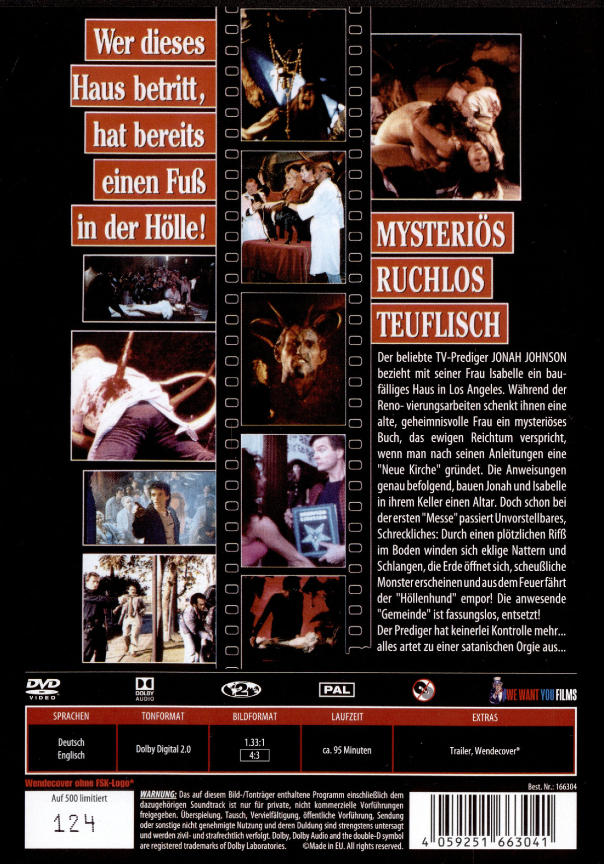 Der beliebte TV-Prediger JONAH JOHNSON bezieht mit seiner Frau Isabelle ein baufälliges Haus in Los Angeles. Während der Reno- vierungsarbeiten schenkt ihnen eine alte, geheimnisvolle Frau ein mysteriöses Buch, das ewigen Reichtum verspricht, wenn man nach seinen Anleitungen eine "Neue Kirche" gründet. Die Anweisungen genau befolgend, bauen Jonah und Isabelle in ihrem Keller einen Altar. Doch schon bei der ersten "Messe" passiert Unvorstellbares, Schreckliches: Durch einen plötzlichen Rifß im Boden winden sich eklige Nattern und Schlangen, die Erde öffnet sich, scheußliche Monster erscheinen und aus dem Feuer fährt der "Höllenhund" empor! Die anwesende "Gemeinde" ist fassungslos, entsetzt! Der Prediger hat keinerlei Kontrolle mehr... alles artet zu einer satanischen Orgie aus...
