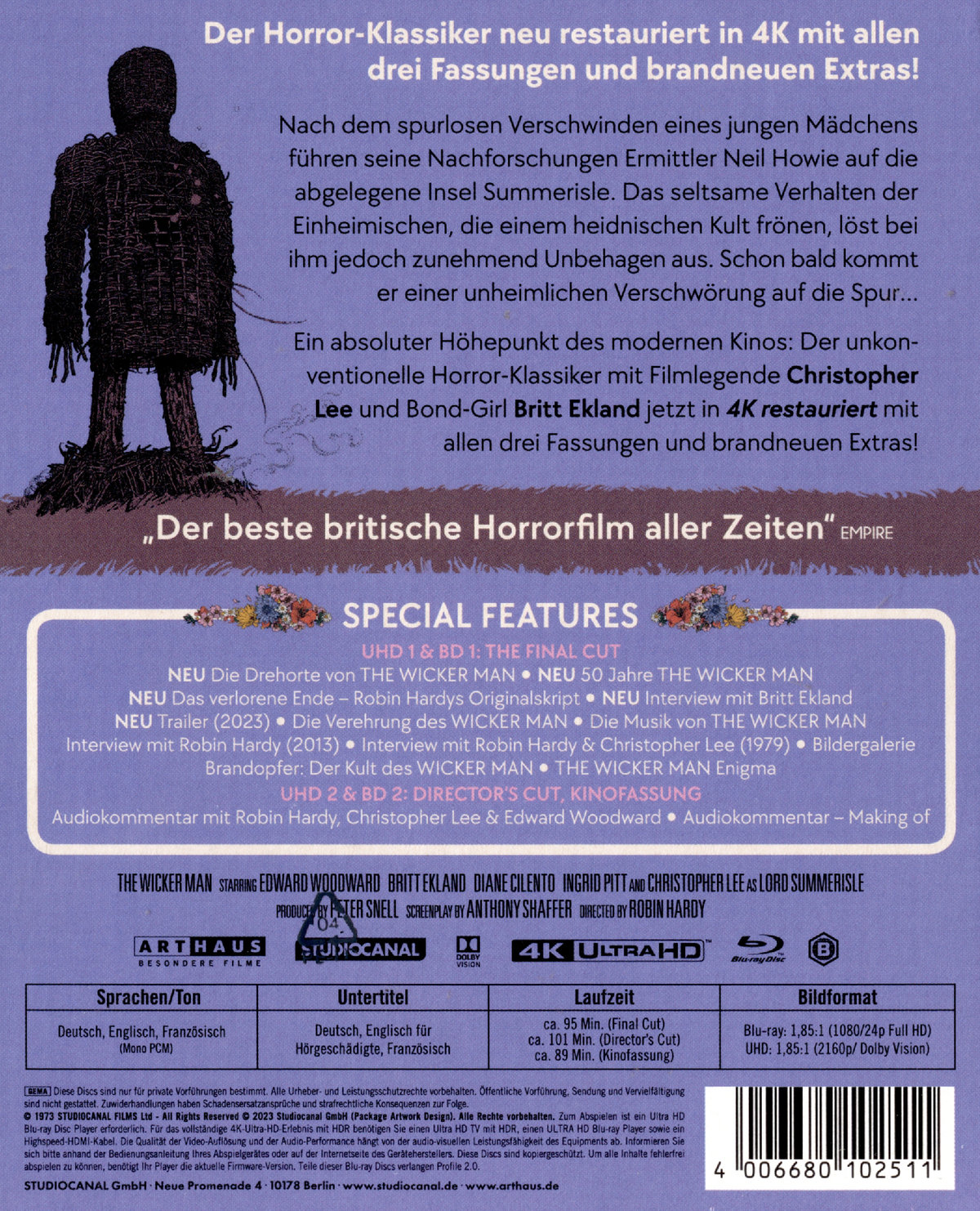 EXTRAS: NEU Die Drehorte von THE WICKER MAN, NEU 50 Jahre THE WICKER MAN, NEU Das verlorene Ende - Robin Hardys Original, NEU Interview mit Britt Ekland, NEU Bildergalerie, Audiokommentar - Making of, Wicker Man Enigma, Brandopfer: Der Kult des WICKER MAN, Die Verehrung des WICKER MAN, Die Musik von THE WICKER MAN, Interview mit Robin Hardy (2013), Interview mit Robin Hardy & Christopher Lee (1979), Trailer, Audiokommentar mit Robin Hardy, Christopher Lee & Edward Woodward (Director's Cut), Alternativer Vorspann