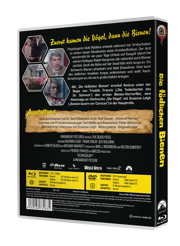 Mit „Die tödlichen Bienen“ erschuf Amicus unter der Regie von Freddie Francis („Die Todeskarten des Dr. Schreck“) den ersten Bienen-Horrorfilm, eine Hommage an Hitchcocks „Die Vögel“, mit Suzanna Leigh („Bestien lauern vor Caracas“) in der Hauptrolle.