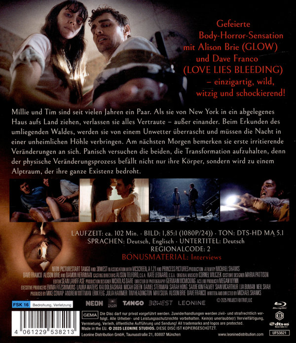Millie und Tim sind seit vielen Jahren ein Paar. Als sie von New York in ein abgelegenes Haus aufs Land ziehen, verlassen sie alles Vertraute - außer einander. Beim Erkunden des umliegenden Waldes, werden sie von einem Unwetter überrascht und müssen die Nacht in einer unheimlichen Höhle verbringen. Am nächsten Morgen bemerken sie erste irritierende Veränderungen an sich. Panisch versuchen die beiden, die Transformation aufzuhalten, denn der physische Veränderungsprozess befällt nicht nur ihre Körper, sondern wird zu einem Alptraum, der ihre ganze Existenz bedroht.