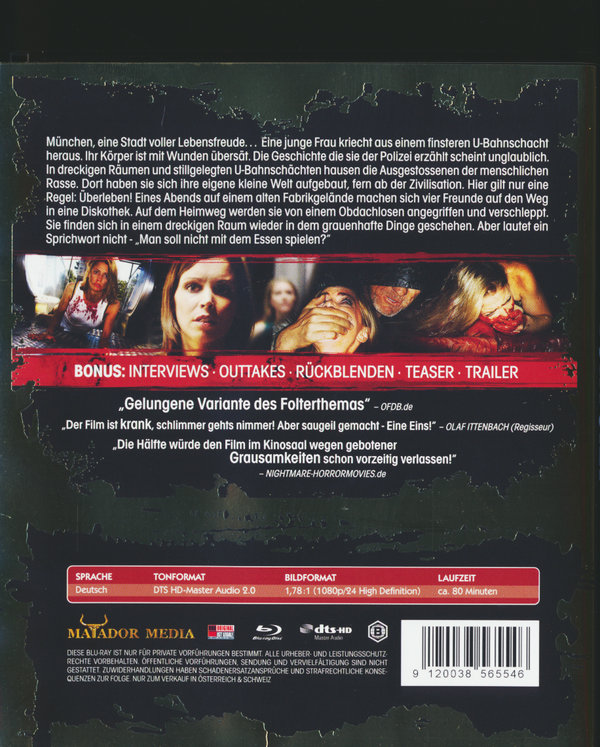 München, eine Stadt voller Lebensfreude... Eine junge Frau kriecht aus einem finsteren U-Bahnschacht heraus. Ihr Körper ist mit Wunden übersät. Die Geschichte die sie der Polizei erzählt scheint unglaublich. In dreckigen Räumen und stillgelegten U-Bahnschächten hausen die Ausgestossenen der menschlichen Rasse. Dort haben sie sich ihre eigene kleine Welt aufgebaut, fern ab der Zivilisation. Hier gilt nur eine Regel: Überleben! Eines Abends auf einem alten Fabrikgelände machen sich vier Freunde auf den Weg in eine Diskothek. Auf dem Heimweg werden sie von einem Obdachlosen angegriffen und verschleppt. Sie finden sich in einem dreckigen Raum wieder in dem grauenhafte Dinge geschehen. Aber lautet ein Sprichwort nicht - "Man soll nicht mit dem Essen spielen?"
