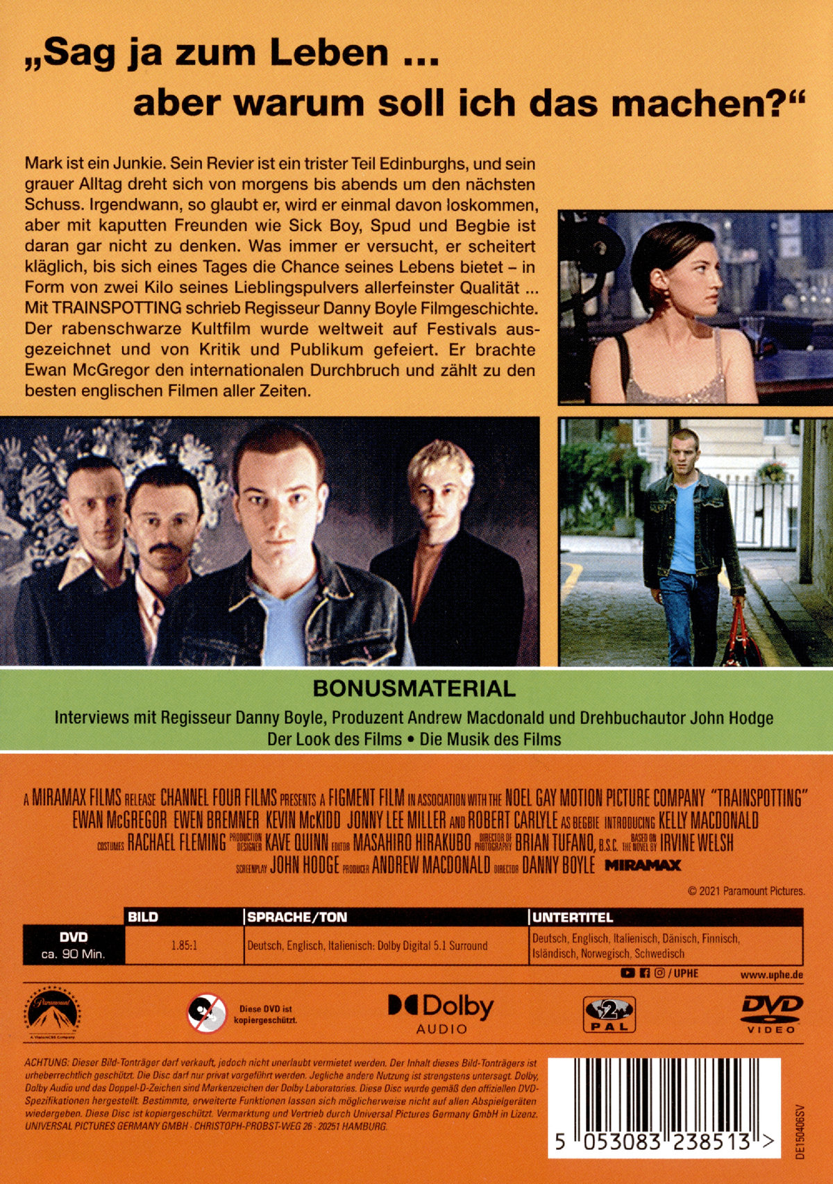 "Sag ja zum Leben … aber warum soll ich das machen?" Mark ist ein Junkie. Sein Revier ist ein trister Teil Edinburghs, und sein grauer Alltag dreht sich von morgens bis abends um den nächsten Schuss. Irgendwann, so glaubt er, wird er einmal davon loskommen, aber mit kaputten Freunden wie Sick Boy, Spud und Begbie ist daran gar nicht zu denken. Was immer er versucht, er scheitert kläglich, bis sich eines Tages die Chance seines Lebens bietet - in Form von zwei Kilo seines Lieblingspulvers allerfeinster Qualität ...Mit "Trainspotting" schrieb Regisseur Danny Boyle Filmgeschichte. Der rabenschwarze Kultfilm wurde weltweit auf Festivals ausgezeichnet und von Kritik und Publikum gefeiert. Er brachte Ewan McGregor den internationalen Durchbruch und zählt zu den besten englischen Filmen aller Zeiten.