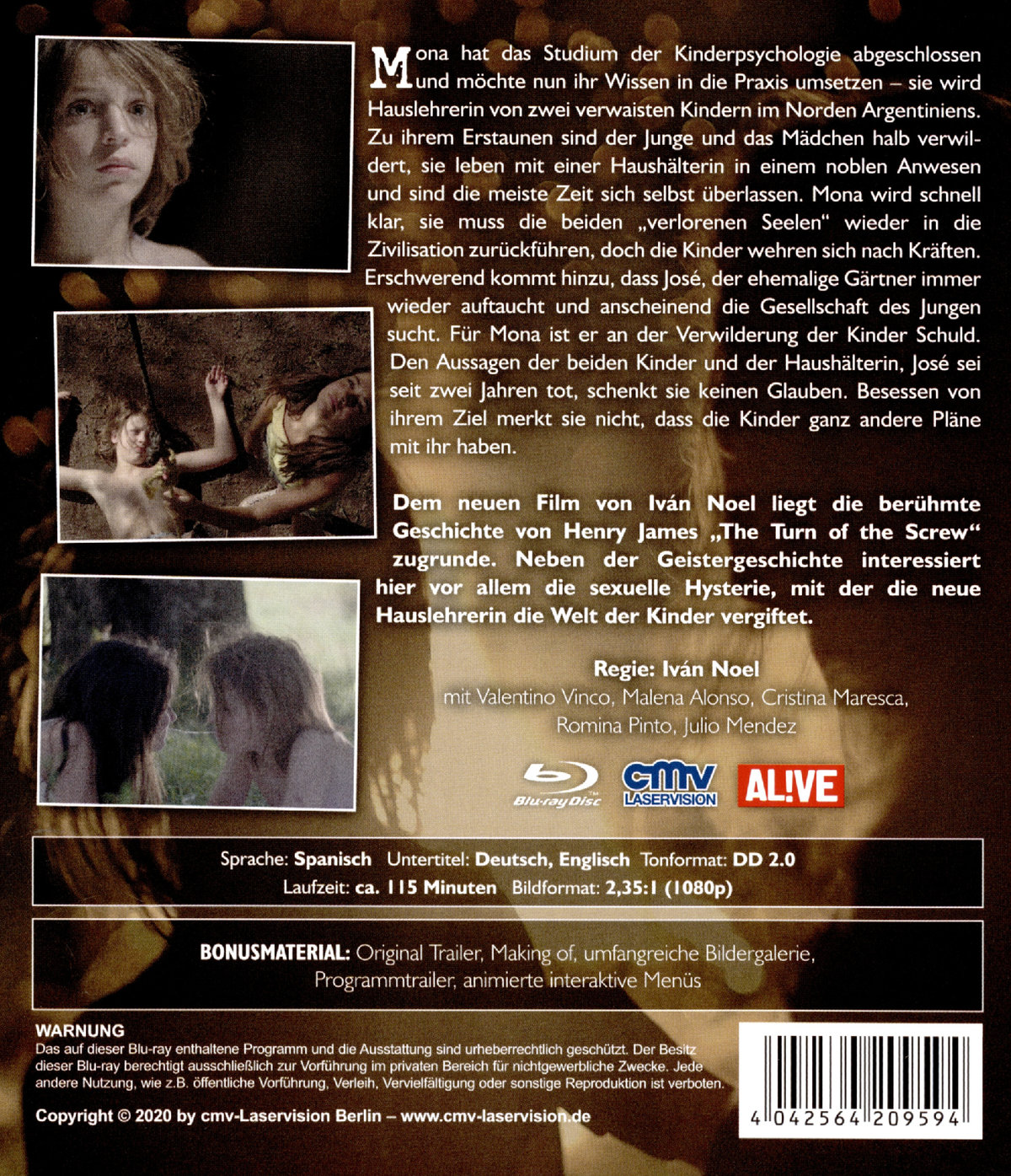 Dem neuen Film von Ivan Noel liegt die berühmte Geschichte von Henry James "The Turn of the Screw" zugrunde. Neben der Geistergeschichte interessiert hier vor allem die sexuelle Hysterie, mit der die neue Hauslehrerin die Welt der Kinder vergiftet, und so ihre Beschützerinstinkte direkt in die Katastrophe führen. Kongenial testet Noel künstlerische und soziale Grenzen aus und erreicht damit eine neue, aufregende Qualität.