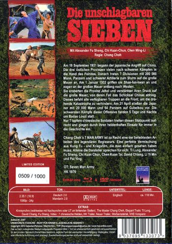Zusatzinfo: Chang Cheh s 7 MAN ARMY ist zu Recht eine der beliebtesten Arbeiten des legendären Regisseurs. Eine perfekte Vermischung aus Kung Fu - und Kriegsfilm, die man einfach gesehen haben muss. Alleine die Darsteller sprechen für sich: Ti Lung, Alexander Fu Sheng, Chi Kuan Chun, Chen Kuan Tai, David Chiang, Li Yi Min und Pai Ying Weltweit das erste Mal auf Blu Ray! Über ?? Minuten länger, als die Kino und Videofassung.