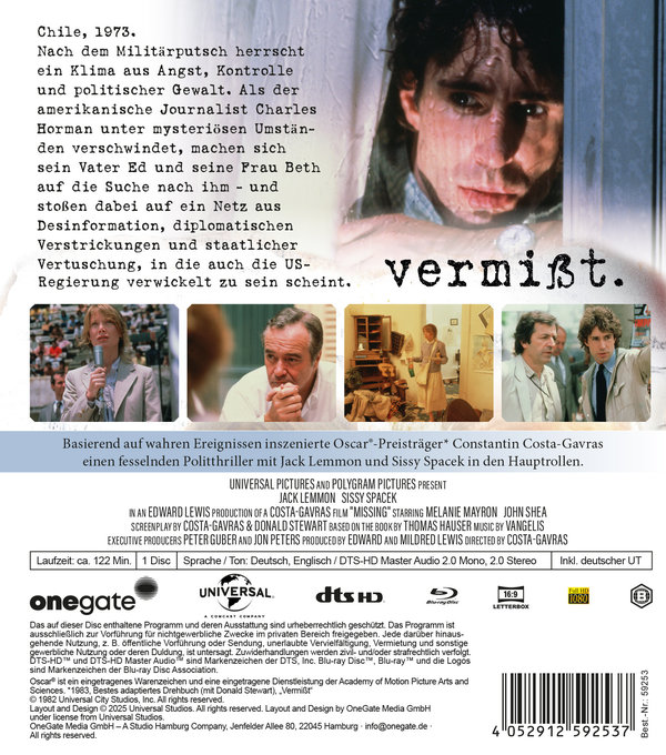 Basierend auf wahren Ereignissen inszenierte Oscar®-Preisträger Constantin Costa-Gavras mit "Vermisst" einen fesselnden Politthriller mit dem mehrfachem Oscar®-gekrönten Jack Lemmon und Oscar®-Preisträgerin Sissy Spacek in den Hauptrollen und gewann 1982 die goldene Palme von Cannes für den besten Film.