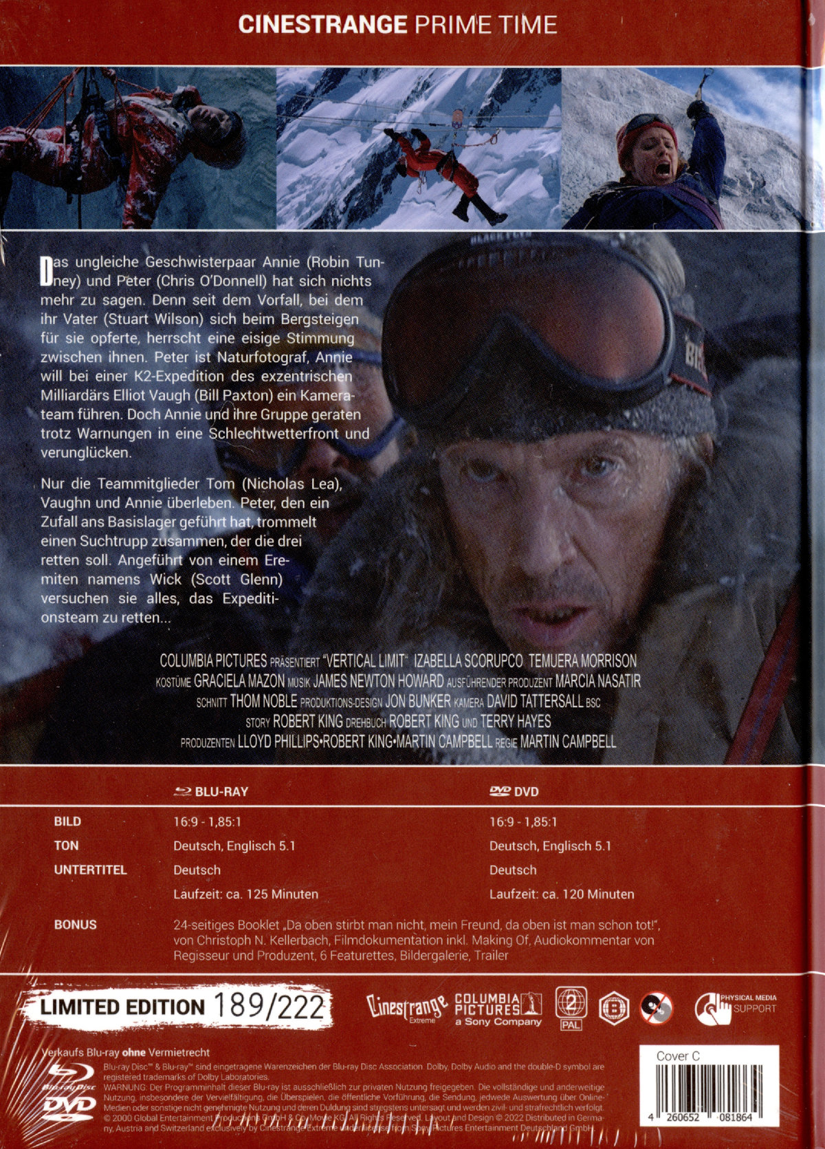 INHALT: Das ungleiche Geschwisterpaar Annie (Robin Tunney) und Peter (Chris O’Donnell) hat sich nichts mehr zu sagen. Seit dem Vorfall, bei dem ihr Vater (Stuart Wilson) sich beim Bergsteigen in einer ausweglosen Gefahrensituation für sie opferte, herrscht eine eisige Stimmung zwischen ihnen. Peter ist Naturfotograf, Annie will bei einer K2-Expedition des exzentrischen Milliardärs Elliot Vaughn (Bill Paxton) ein Kamerateam führen. Doch Annie und ihre Gruppe geraten trotz Warnungen in eine Schlechtwetterfront und verunglücken. Nur die Teammitglieder Tom (Nicholas Lea), Vaughn und Annie überleben. Peter, den ein Zufall ans Basislager geführt hat, trommelt einen Suchtrupp zusammen, der die drei retten soll. Angeführt von einem bergerfahrenen Eremiten namens Wick (Scott Glenn) versuchen sie alles, das Expeditionsteam zu retten... CINESTRANGE EXTREME präsentiert in der Prime Time-Reihe den Action-Kracher VERTICAL LIMIT in Deutschland erstmals als Mediabook mit den drei Original-Coverartworks. "Ein fotografisch eindrucksvolles Bergsteigerdrama, dessen Konfliktpotenzial sich den Dimensionen einer antiken Tragödie annähert." [Lexikon des internationalen Films] EXTRAS: „h24-seitiges Booklet "Da oben stirbt man nicht..." von Christoph N. Kellerbach „hFilmdokumentation incl Making Of „hAudiokommentar von Regisseur und Produzent „hBildergalerie „hTrailer