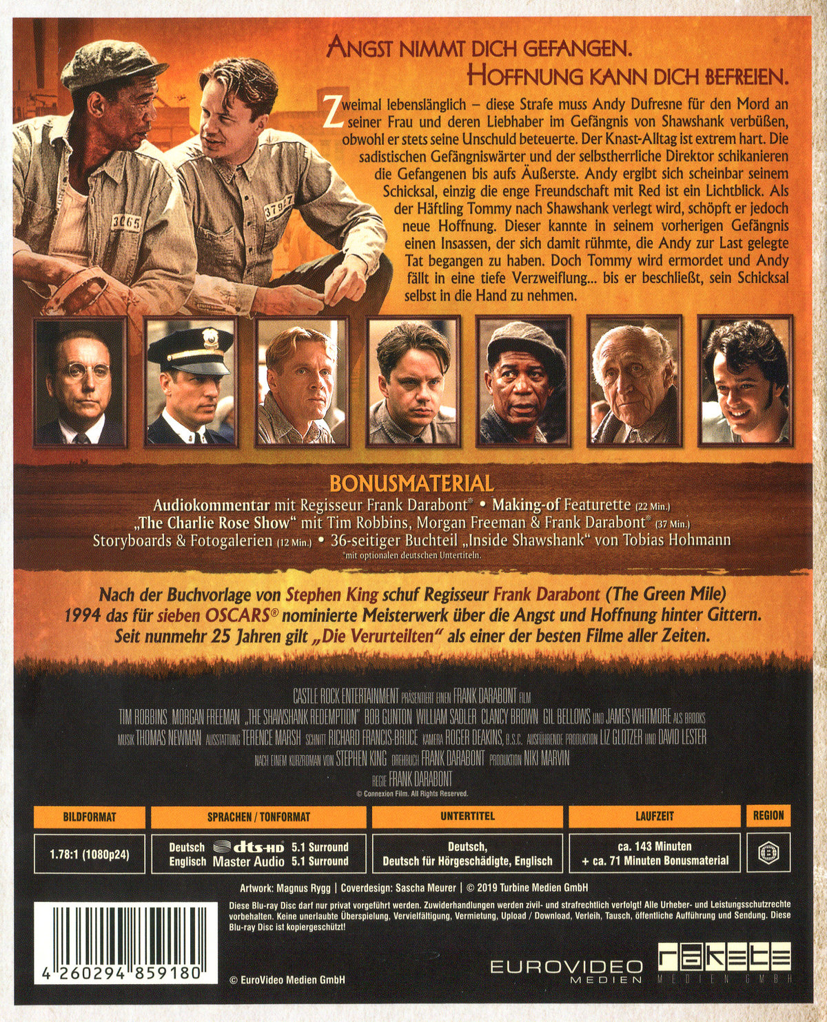 Zweimal lebenslänglich – diese Strafe muss Andy Dufresne für den Mord an seiner Frau und deren Liebhaber im Gefängnis von Shawshank verbüßen, obwohl er stets seine Unschuld beteuerte. Der Knast-Alltag ist extrem hart. Die sadistischen Gefängniswärter und der selbstherrliche Direktor schikanieren die Gefangenen bis aufs Äußerste. Andy ergibt sich scheinbar seinem Schicksal, einzig die enge Freundschaft mit Red ist ein Lichtblick. Als der Häftling Tommy nach Shawshank verlegt wird, schöpft er jedoch neue Hoffnung. Dieser kannte in seinem vorherigen Gefängnis einen Insassen, der sich damit rühmte, die Andy zur Last gelegte Tat begangen zu haben. Doch Tommy wird ermordet und Andy fällt in eine tiefe Verzweiflung... bis er beschließt, sein Schicksal selbst in die Hand zu nehmen. Nach der Buchvorlage von Stephen King schuf Regisseur Frank Darabont (The Green Mile) 1994 das für sieben OSCARS® nominierte Meisterwerk über die Angst und Hoffnung hinter Gittern. Seit nunmehr 25 Jahren gilt "Die Verurteilten" als einer der besten Filme aller Zeiten.