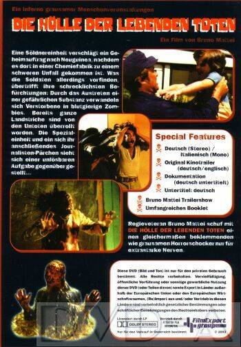 Italienischer Zombiestreifen aus den frühen 80ern mit Teilen des Original-Goblin-Soundtracks aus Romeros "Zombie". Der Streifen hält einige blutige Szenen bereit. Diese können aber nicht über die recht überschaubare Minimalhandlung und die teils dümmlichen Dialoge hinwegtäuschen: Ein SWAT-Team erhält den Auftrag die Beweise eines schief gelaufenen Experiments zu beseitigen und den Schaden einzudämmen. Der Mittelteil von "Virus" aka "Hölle der lebenden Toten" wird mittels Originalaufnahmen einer Dokumentation über primitive Völker Neuguineas dorch arg in die Länge gezogen. Die Bildqualität der DVD bewegt sich im mehr als durchschnittlichen Bereich. Der Ton passt sich hierbei mühelos an. Die DVD enthält neben einem Schuber noch das Originalcover des Streifens.