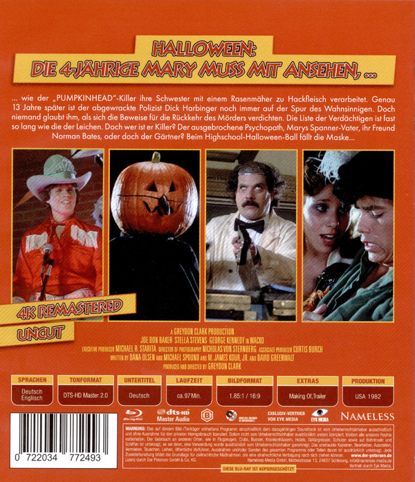 Halloween: Die 4- Jährige Mary muss mit ansehen, ... wie der „PUMPKINHEAD“-Killer ihre Schwester mit einem Rasenmäher zu Hackfleisch verarbeitet. Genau 13 Jahre später ist der abgewrackte Polizist Dick Harbinger noch immer auf der Spur des Wahnsinnigen. Doch niemand glaubt ihm, als sich die Beweise für die Rückkehr des Mörders verdichten. Die Liste der Verdächtigen ist fast so lang wie die der Leichen. Doch wer ist er Killer? Der ausgebrochene Psychopath, Marys Spanner-Vater, ihr Freund Norman Bates, oder doch der Gärtner? Beim Highschool-Halloween-Ball fällt die Maske..