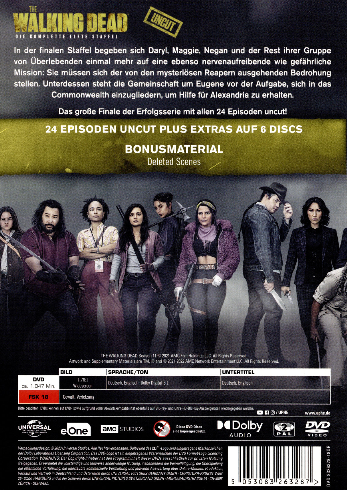 In der finalen Staffel begeben sich Daryl, Maggie, Negan und der Rest ihrer Gruppe von Überlebenden einmal mehr auf eine ebenso nervenaufreibende wie gefährliche Mission: Sie müssen sich der von den mysteriösen Reapern ausgehenden Bedrohung stellen. Unterdessen steht die Gemeinschaft um Eugene vor der Aufgabe, sich in das Commonwealth einzugliedern, um Hilfe für Alexandria zu erhalten.Das große Finale der Erfolgsserie mit allen 24 Episoden uncut!24 Episoden auf 6 DiscsDisc 1- Acheron: Teil 1- Acheron: Teil 2- Gejagt- AnsichtenDisc 2- Aus der Asche- Im Inneren- Gebrochene Versprechen- Für BlutDisc 3- Kein anderer Weg- Neue Orte des Grauens- Ein abtrünniges Element- Die GlücklichenDisc 4- Warlords- Der verdorbene Kern- Vertrauen- Höhere GewaltDisc 5- Lockdown- Ein neuer Deal- Variante- Was verloren gegangen istDisc 6- Außenposten 22- Glaube- Familie- Ruhe in Frieden