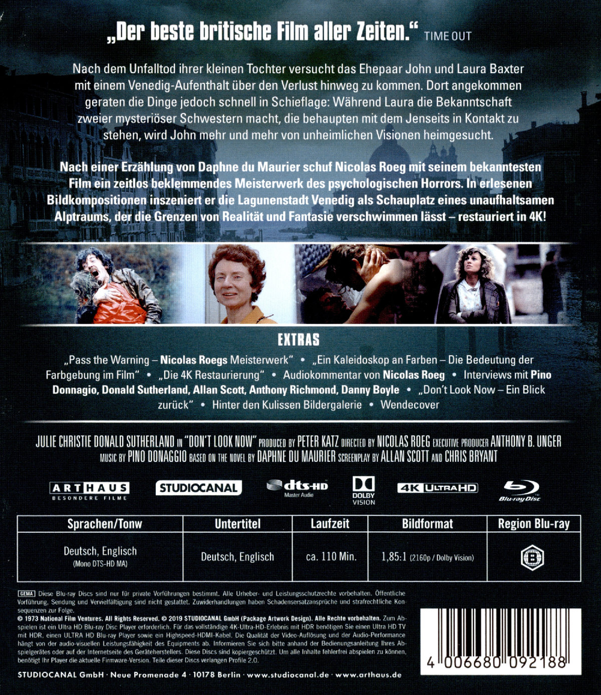 "Pass the Warning - Nicolas Roegs Meisterwerk", "Ein kaleidoskop an Farben - die Bedeutung der Farbgebung im Film", "Die 4K Restaurierung", Audiokommentar von Nicolas Roeg, Interviews mit Pino Donnagio, Donald Sutherland, Allan Scott, Anthony Richmond, Danny Boyle, "Don`t look now - Ein Blick zurück", Hinter den Kulissen, Bildgalerie, Wendecover