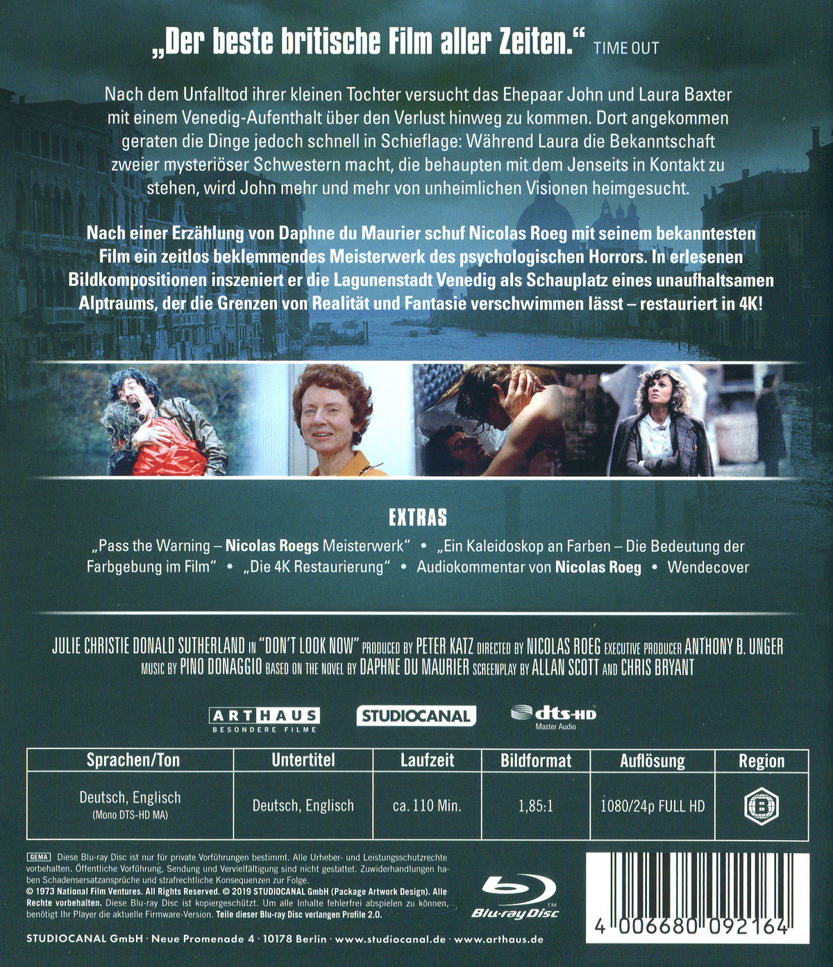 Nicolas Roegs Verfilmung der Erzählung von Daphne du Maurier besticht durch eine erlesene Farbgebung und Bildkomposition. In den Hauptrollen des atmosphärisch dichten Psychothrillers glänzen Donald Sutherland und Julie Christie, deren legendäre Sexszene für einen handfesten Skandal sorgte.