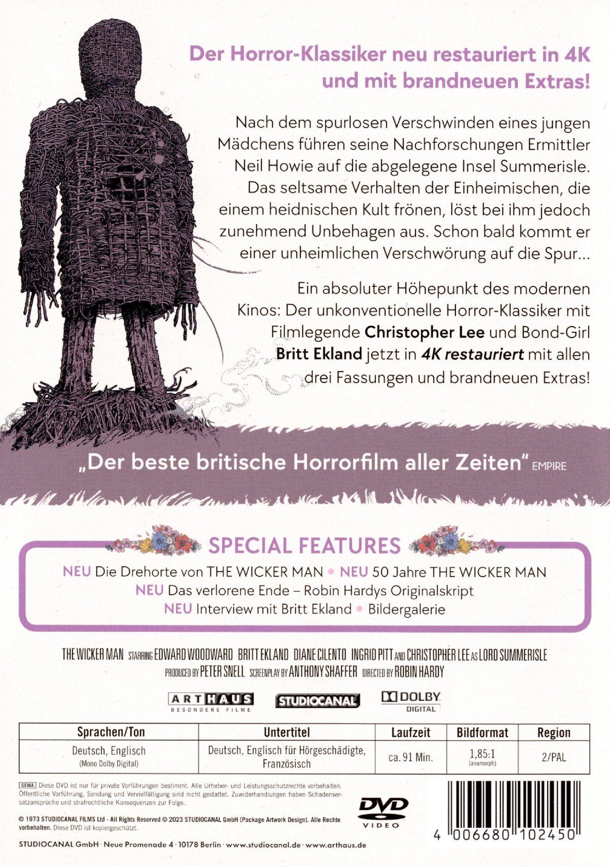 Das Regie-Debüt von Robin Hardy vereint neben dem Equalizer-Serienhelden Edward Woodward auch Bond-Girl Britt Ekland und den legendären Horrorfilm-Veteran Christopher Lee in einer seiner besten Rollen. Mit seinen atmosphärischen Schauplätzen, beunruhigenden Bildern und dem eindringlichen Soundtrack baut Hardy allmählich einen der furchterregendsten und kultigsten Höhepunkte des modernen Kinos auf. Der unkonventionelle Kultfilm nach dem brillanten Drehbuch von Anthony Shaffer setzt auf einen Mix aus Kriminalfilm, experimentellem Horror und einer Prise Musical und wurde 1978 mit dem Saturn Award für den besten Horrorfilm ausgezeichnet.