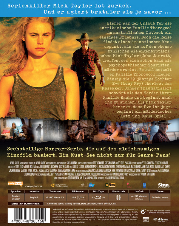 WOLF CREEK ist eine sechsteilige, australische Horror-Serie, die auf dem gleichnamigen Kinofilm aus dem Jahr 2005 basiert. Ein "must see" nicht nur für hartgesottene Genre-Fans!