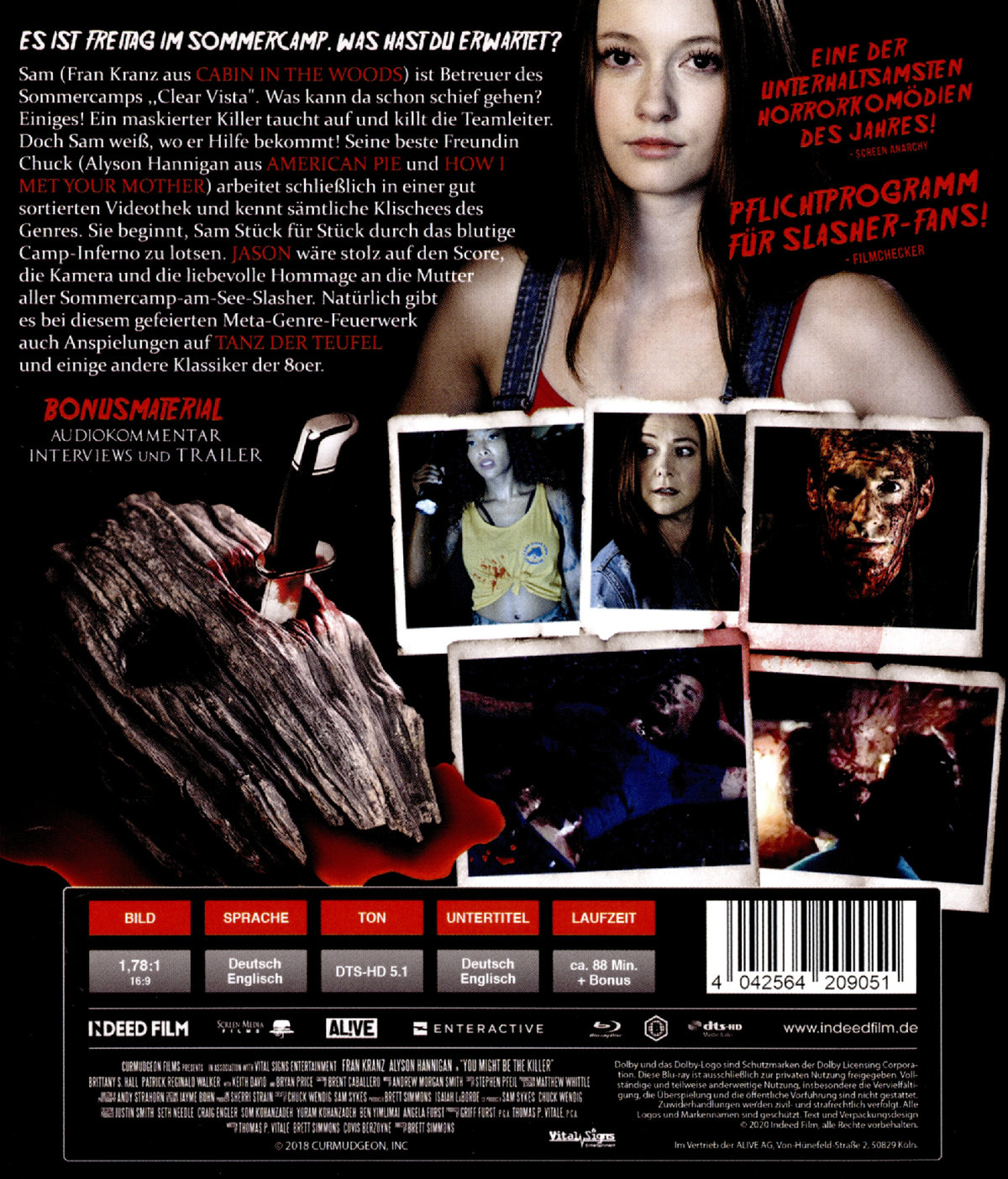 Sam (Fran Kranz aus "Cabin in the Woods") ist Betreuer des Sommercamps "Clear Vista" an einem einsam gelegenen See. Was kann da schon schief gehen? Eine ganze Menge, wie der gut informierte Slasher-Fan bereits vermutet. Prompt taucht ein maskierter Killer auf und massakriert die Teamleiter. Doch Sam weiß, wo er Hilfe bekommt! Seine beste Freundin Chuck (Alyson Hannigan aus "American Pie", "How I Met Your Mother" und "Buffy") ist schließlich Verkäuferin in einer gut sortierten Videothek und kennt sämtliche Klischees des Slasher-Genres. Sie beginnt, Sam Stück für Stück durch das blutige Camp-Inferno zu lotsen. "You Might Be The Killer" glänzt durch ein cleveres Drehbuch mit einigen faustdicken Überraschungen. Jason wäre stolz auf den Score, die Kamera und die liebevolle Hommage an die Mutter aller Sommercamp-am-See-Slasher. Natürlich gibt es bei diesem gefeierten Meta-Genrefeuerwerk auch Anspielungen auf "Tanz der Teufel" und andere Klassiker der frühen 1980er. Ein Liebesbrief an das Genre und Pflichtprogramm für Fans von "Freitag, der 13."
