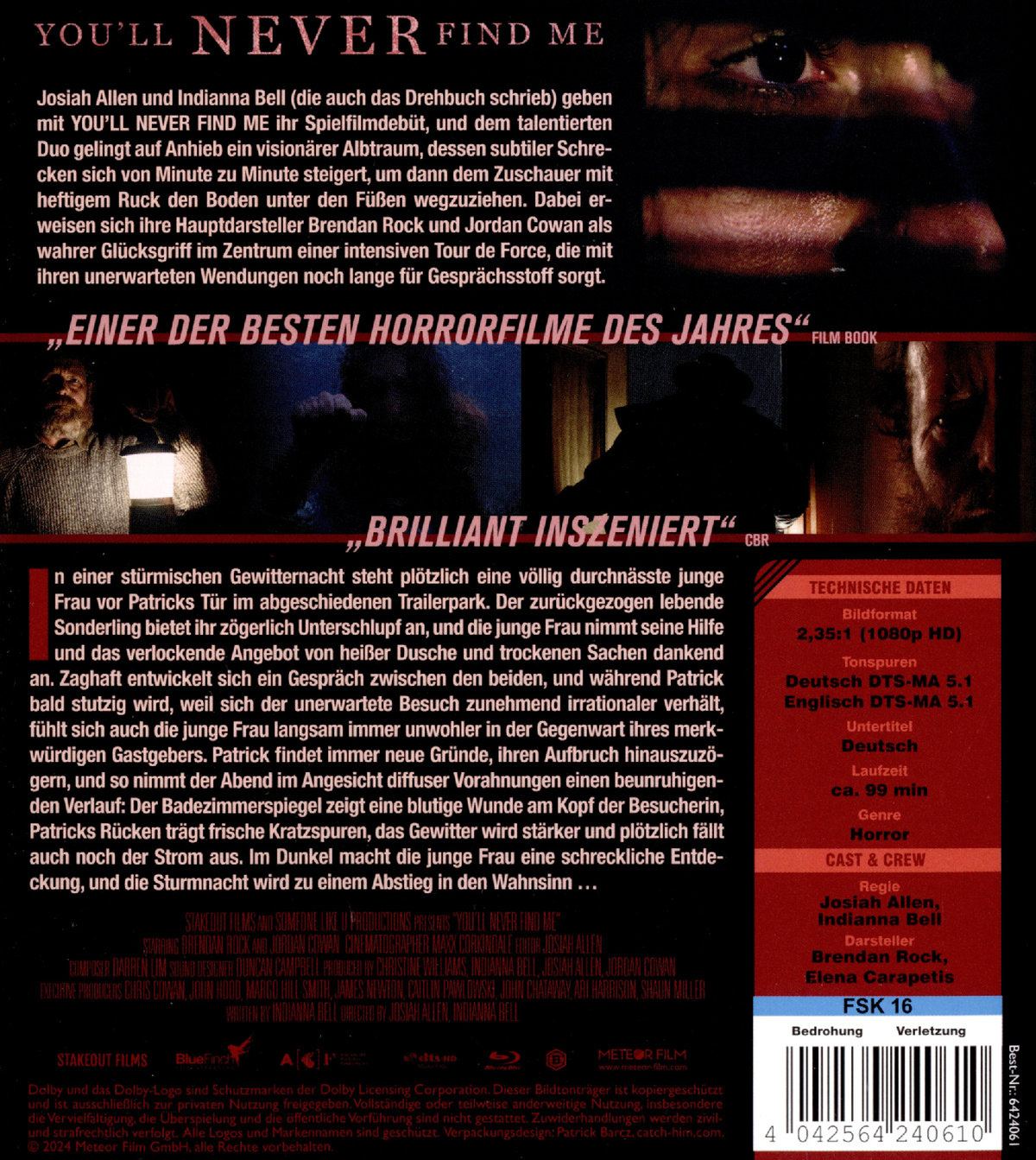In einer stürmischen Gewitternacht steht plötzlich eine völlig durchnässte junge Frau vor Patricks Tür im abgeschiedenen Trailerpark. Der zurückgezogen lebende Sonderling bietet ihr zögerlich Unterschlupf an, und die junge Frau nimmt seine Hilfe und das verlockende Angebot von heißer Dusche und trockenen Sachen dankend an. Zaghaft entwickelt sich ein Gespräch zwischen den beiden, und während Patrick bald stutzig wird, weil sich der unerwartete Besuch zunehmend irrationaler verhält, fühlt sich auch die junge Frau langsam immer unwohler in der Gegenwart ihres merkwürdigen Gastgebers. Patrick findet immer neue Gründe, ihren Aufbruch hinauszuzögern, und so nimmt der Abend im Angesicht diffuser Vorahnungen einen beunruhigenden Verlauf: Der Badezimmerspiegel zeigt eine blutige Wunde am Kopf der Besucherin, Patricks Rücken trägt frische Kratzspuren, das Gewitter wird stärker und plötzlich fällt auch noch der Strom aus. Im Dunkel macht die junge Frau eine schreckliche Entdeckung, und die Sturmnacht wird zu einem Abstieg in den Wahnsinn … Josiah Allen und Indianna Bell (die auch das Drehbuch schrieb) geben mit YOU’LL NEVER FIND ME ihr Spielfilmdebüt, und dem talentierten Duo gelingt auf Anhieb ein visionärer Albtraum, dessen subtiler Schrecken sich von Minute zu Minute steigert, um dann dem Zuschauer mit heftigem Ruck den Boden unter den Füßen wegzuziehen. Dabei erweisen sich ihre Hauptdarsteller Brendan Rock und Jordan Cowan als wahrer Glücksgriff im Zentrum einer intensiven Tour de Force, die mit ihren unerwarteten Wendungen noch lange für Gesprächsstoff sorgt.