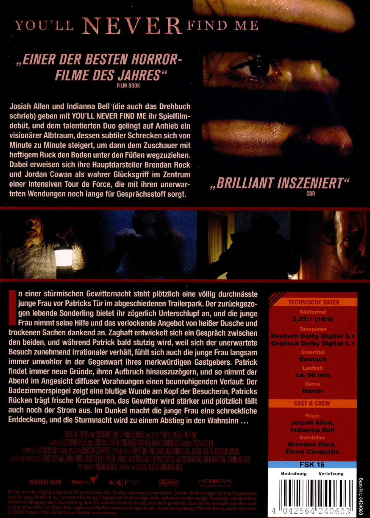 Josiah Allen und Indianna Bell (die auch das Drehbuch schrieb) geben mit YOU’LL NEVER FIND ME ihr Spielfilmdebüt, und dem talentierten Duo gelingt auf Anhieb ein visionärer Albtraum, dessen subtiler Schrecken sich von Minute zu Minute steigert, um dann dem Zuschauer mit heftigem Ruck den Boden unter den Füßen wegzuziehen. Dabei erweisen sich ihre Hauptdarsteller Brendan Rock und Jordan Cowan als wahrer Glücksgriff im Zentrum einer intensiven Tour de Force, die mit ihren unerwarteten Wendungen noch lange für Gesprächsstoff sorgt.