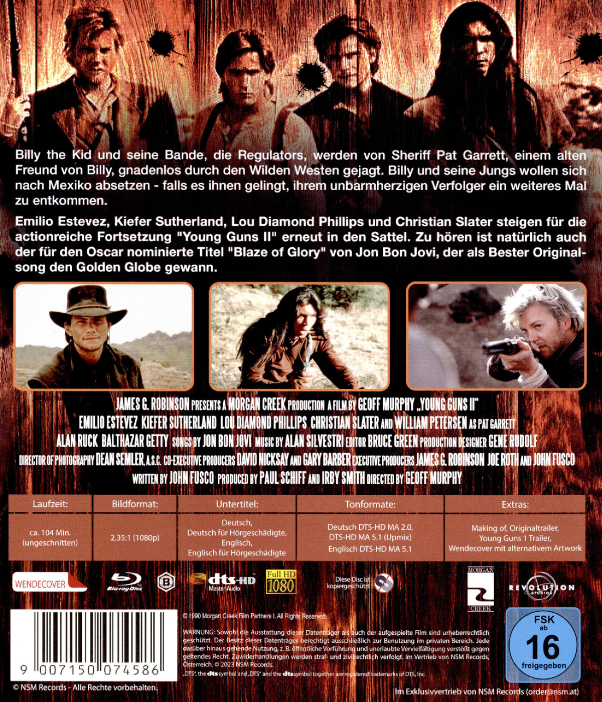 Billy the Kid und seine Bande, die Regulators, werden von Sheriff Pat Garrett, einem alten Freund von Billy, gnadenlos durch den Wilden Westen gejagt. Billy und seine Jungs wollen sich nach Mexico absetzen - falls es ihnen gelingt, ihrem unbarmherzigen Verfolger ein weiteres Mal zu entkommen. Emilio Estevez, Kiefer Sutherland, Lou Diamond Philips und Christian Slater steigen für die actionreiche Fortsetzung "Young Guns II" erneut in den Sattel. Zu hören ist natürlich auch der für den Oscar nominierte Titel "Blaze of Glory" von Jon Bon Jovi, der als Bester Originalsong den Golden Globe gewann.