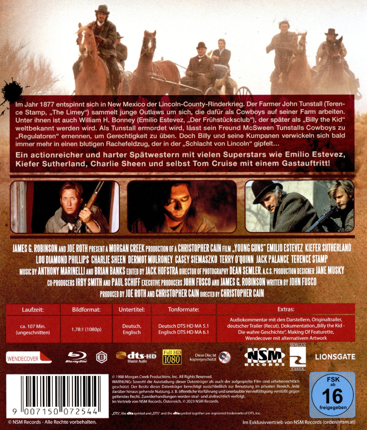 1878, Lincoln County. In einer Zeit ohne Gesetz und Ordnung werden sechs Außenseiter von einem Rancher angeheuert. Die "Regulators" bewachen das Land vor Dieben und Mördern. Doch das Gesetz ist machtlos gegen den korrupten und mächtigen Santa Fe Ring, als ihr Auftraggeber hinterhältig ermordet wurde. Die "Regulators" erklären dem Ring den Krieg. Ihre brutale Rache macht sie zu den meistgesuchten Gesetzlosen des Westens. Mit der wachsenden Berühmtheit der Young Guns wird ihr Anführer zur Legende. Sie nannten ihn "Billy the Kid".