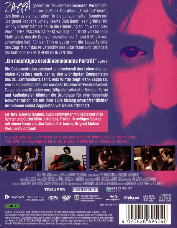 Frank Zappa gehört zu den einflussreichsten Persönlichkeiten des Rock. Das Album ,,Freak Out“ diente den Beatles als Inspiration für die collagenhaften Sounds auf ,,Sergeant Pepper's Lonely Hearts Club Band“, sein größter Hit ,,Bobby Brown“ hält bis heute die Erinnerung an ihn wach. Alex Winter (THE PANAMA PAPERS) würdigt das 1993 verstorbene Multitalent, das die Grenzen zwischen der E- und U-Musik verschwinden ließ. Für den Film erlaubte ihm die Zappa-Familie den Zugriff auf das Privatarchiv des Gitarristen und Gründers der Kultband Mothers of Invention. Die Dokumentation zeichnet eindrucksvoll das Leben des genialen Künstlers nach, der zu den wichtigsten Komponisten des 20. Jahrhunderts zählt. Alex Winter zeigt Frank Zappa so, wie er sich selbst sah – als seriösen Musiker im Freak-Gewand. Tausende von Stunden sorgfältig digitalisierter Videos, Fotos und Audiodateien bildeten die Grundlage für eine fesselnde Dokumentation, die mit ihrer Fülle bislang unveröffentlichter Aufnahmen selbst Zappaisten viel Neues offenbart. (1 Blu-ray + 1 DVD)