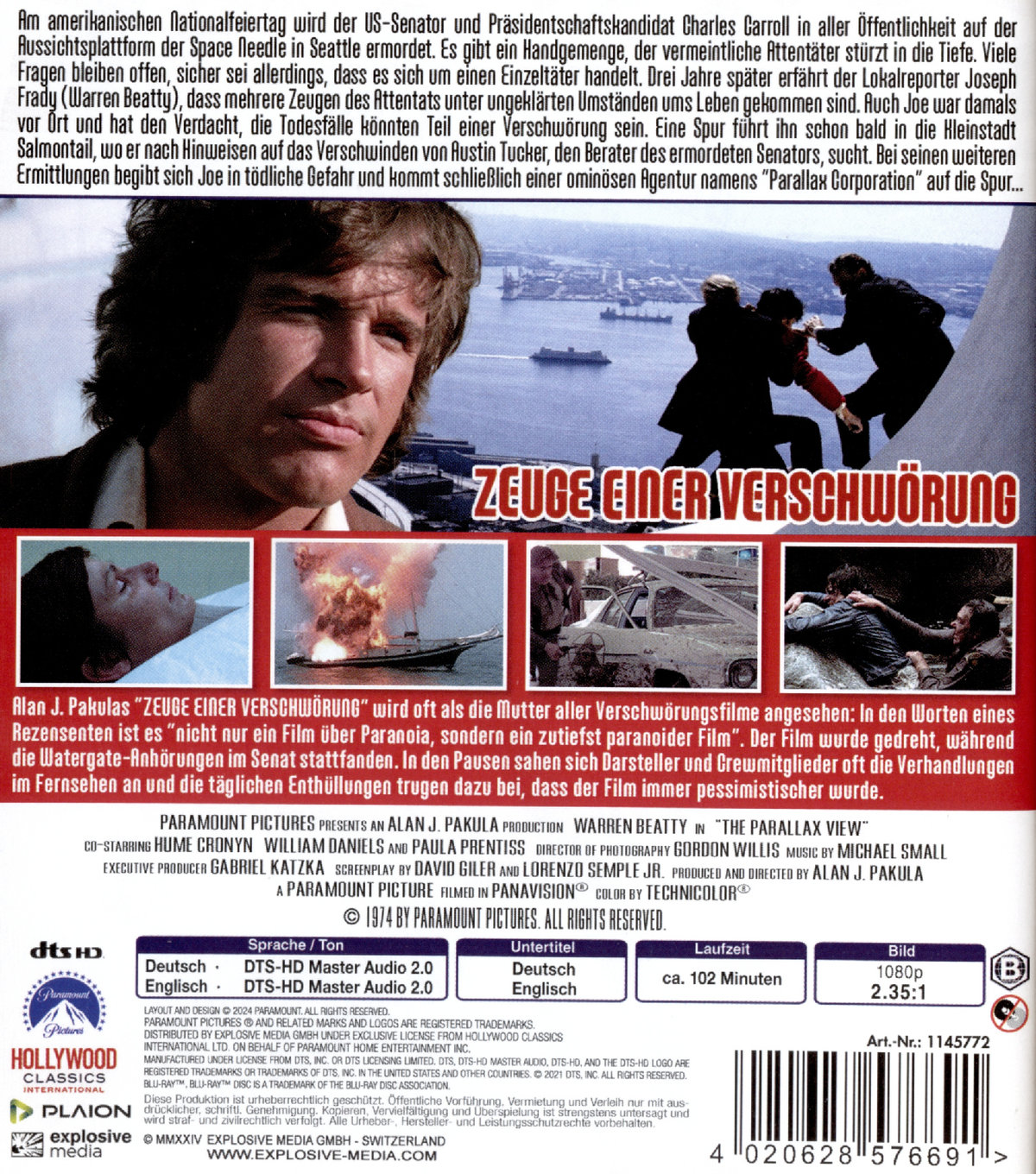Parallax beginnt mit einer Parade zum 4. Juli in Seattle - Pakula wollte "mit sonnenbeschienenem Americana beginnen, dem Amerika, das wir verloren haben" - eine Sequenz, die auf der Space Needle mit der plötzlichen Ermordung eines jungen Senators endet, der für das Präsidentenamt kandidiert. Drei Jahre später wird der obskure, verrückte Reporter Joe Frady (Beatty) von einem alten Freund angesprochen, der ihm erzählt, dass Zeugen des Attentats auf mysteriöse Weise gestorben sind. Sie hat Angst; Sie waren beide an diesem Tag dort, aber Frady hat seine eigenen Probleme. ("Möchten Sie etwas über meinen Tag hören?", antwortet er ungeduldig.) Sie tritt durch einen wogenden weißen Vorhang ein und aus - Frady hätte es besser wissen müssen -, während der Film sofort zur Leichenhalle übergeht. In Verschwörungsfilmen kommt es häufig vor, dass der "zufällige" Tod eines Alarmisten den Protagonisten dazu zwingt, sich für die Sache einzusetzen.