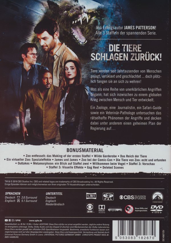 Von Erfolgsautor James Patterson! Alle 3 Staffeln der spannenden Serie. Die Tiere schlagen zurück! Tiere werden seit Jahrtausenden von Menschen gejagt, versklavt und geschlachtet ... doch plötzlich fangen sie an sich zu wehren! Was als eine Reihe von unerklärlichen Angriffen begann, hat sich inzwischen zu einem globalen Krieg zwischen Mensch und Tier entwickelt. Ein Zoologe, eine Journalistin, ein Safari-Guide sowie ein Veterinär-Pathologe untersuchen das rätselhafte Phänomen der Angriffe und decken dabei unter anderem einen geheimen Plan der Regierung auf... Alle 39 Episoden auf 12 Discs. Staffel 1- Der trotzige Blick- Aufstand der Katzen- Fledermäuse über Fukushima- Das Alphatier- Die Mutterzelle- Schlechter Deal- Winterschlaf- Das Rattenschiff- Im Visier der Vögel- Allianz der Tiere- Angriff der Leoparden- Das Heilmittel- Die letzte Hoffnung Staffel 2- Der Tag der Bestie- Blutregen- Attacke der Ameise- Grausames Gas- Die Tripelhelix- Sex, Lügen und Quallen- Das Geister-Gen- Die Eis-Eidechse- Das Knochenrätsel- Hölle in Helsinki- Gorillas im Fahrstuhl- Die Säbelzahnkatze- Clementine Staffel 3- Die Rückkehr- Durchbruch- Geständnisse- Auf der anderen Seite- Loslassen- One-Night-Stand- Wer ist Mr. Duncan?- Gefahr in den Wolken- Das letzte Puzzleteil- Der Tod ist nur der Anfang- Der Retter der Welt- Im Westen viel Neues- Der Schutzwall